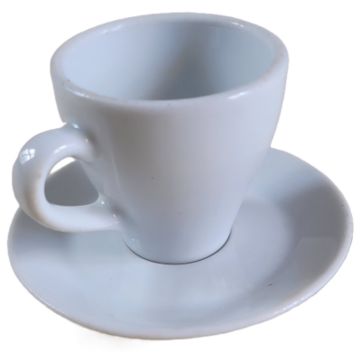 Biała, porcelanowa filiżanka espresso ze spodkiem, która charakteryzuje się grubymi ściankami i klasycznym, kawiarnianym stylem. Na podstawie cech wizualnych, takich jak charakterystyczny kształt ucha oraz zwężająca się ku dołowi forma, produkt ten jest najprawdopodobniej modelem z linii Lubiana Paula.