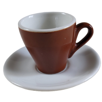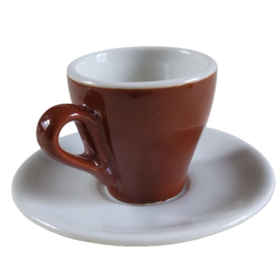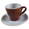 Brązowa porcelanowa filiżanka espresso ze spodkiem, która kształtem i kolorystyką najbardziej przypomina produkty znanych marek baristycznych, takich jak Loveramics czy Cilio.