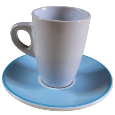 Ceramiczna filiżanka do espresso z pasującym spodkiem. Ze względu na charakterystyczny, smukły kształt oraz kontrastujące kolory (jasnoszara/beżowa czasza i niebieski spodek), model ten jest identyfikowany jako element kolekcji Concerto Fuse Azzurro włoskiej marki Rose&Tulipani.