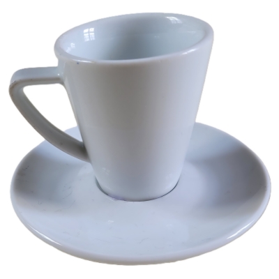 Zestaw wykonany z porcelany, charakteryzujący się specyficznym kształtem i logo kawiarni.