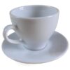 Klasyczna, biała filiżanka cappuccino porcelanowa ze spodkiem, która kształtem przypomina popularne modele gastronomiczne i domowe. Podobne produkty to m.in.: